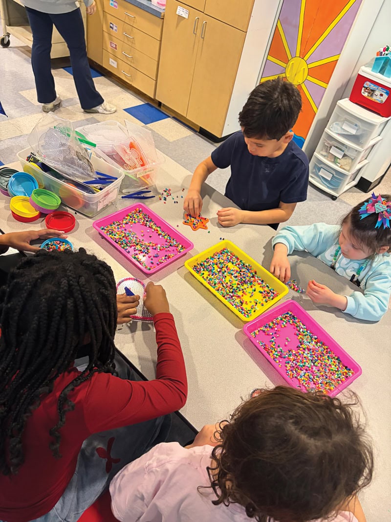 The afternoon balanced this physical activity with creativity and play. During the art session, campers explored color theory by creating vibrant heart masterpieces. To make their art pop, they learned to distinguish between warm tones, such as the reds, oranges, and yellows of fire, and cool tones, such as the blues, greens, and purples of a calm ocean. This creativity carried over into ‘Camper’s Choice’ where campers made fuse bead designs and strung together custom bracelets and necklaces with colorful pony beads, or participated in ‘Just Dance’.