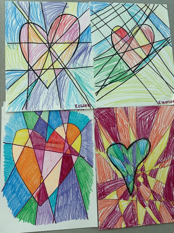 Rowen Reyes, Eleanor Sheffy, Blake Sisler, and Theo Trem worked hard on their Radiating Hearts art. projects.
