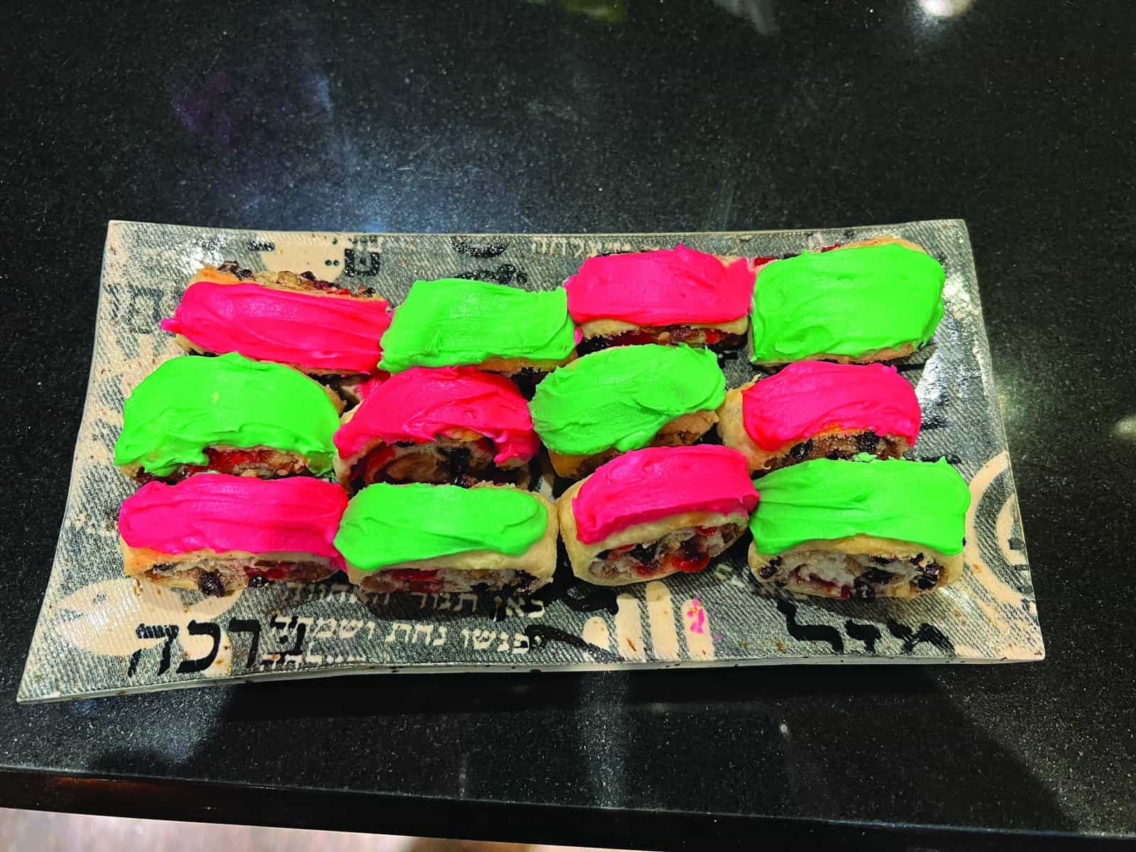 She had her specialties that are still treasures. One of my favorites is what we call “Pink and Greens.” They are a delicious cookie that is best described as an iced rugulach. My family loved these, and I always felt proud to bring them places knowing they were (to me) a Jewish cookie. In the 1980s pink and green were the colors so I brought “preppie” cookies, and when my friends starting having babies, I changed them to “pink and blues” for shower cookies. Plus, I made them for my kids with team colors and other special requests over the years. They are a little easier than traditional rugulach as you roll the dough into stuffed logs and slice the cookies rather than handroll each crescent. The icing is with almond extract and is delicious!
