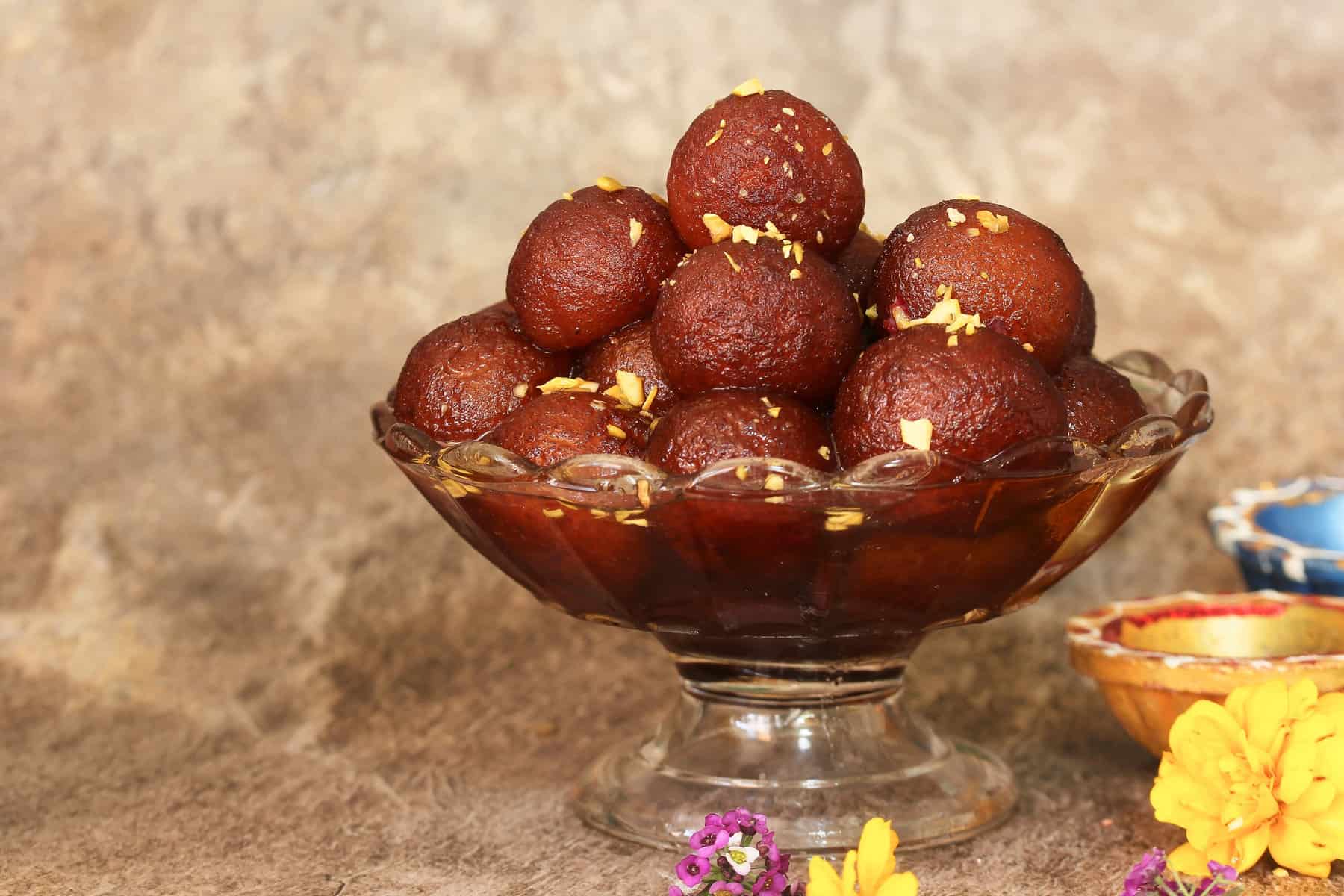 6. Drown fritters in hot syrup in a separate bowl. Plate to serve, drizzle rose water on top and garnish with whatever you like. Some people keep their jamun balls soaking for hours before serving.