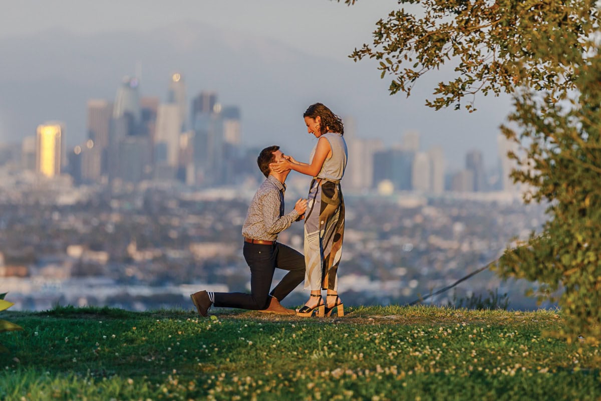 We changed for dinner and set out for the Kenneth Hahn Recreation Area, a sprawling park where I had scoped out a spot with a gorgeous view of the L.A. skyline framed by mountains. A photographer hid behind a tree, waiting to capture the moment. When the light was just right, I got down on one knee. Luckily, she said yes!