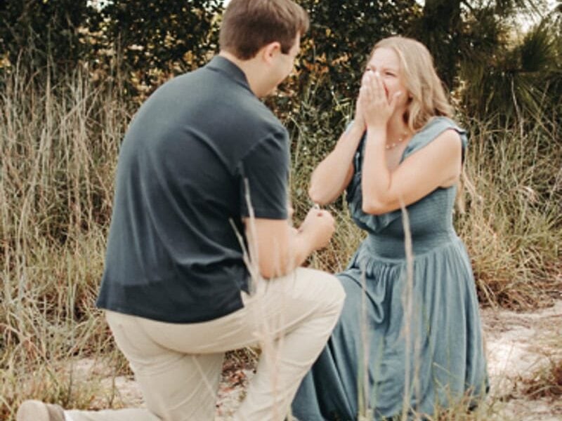 Sam proposed to Christa at First Landing Park near the water. He also wanted a place they could always revisit. For the proposal, Sam secretly hired a photographer and said, “let’s go get our pictures taken.”