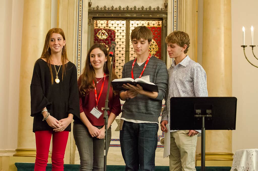 On Friday, Nov. 16, Ohef Sholom Temple in Norfolk welcomed more than 220 teens and advisors from Delaware to North Carolina to stay with OSTY for the weekend. Fall Kallah is one of the North American Federation of Temple Youth— Mid-Atlantic Region’s five events held each year. With the help of the elected regional board, the OSTY Quadchairs—Skylar Arias, Madeline Budman, Franklin Kramer, and Ben Laderberg—planned the highly anticipated weekend of programming, Jewish learning, and lots of fun. The four teens, along with their devoted advisors Amy and Eliot Weinstein, began meeting weekly in August. And, more than 15 OSTY members served on various committees to help ensure a successful event.