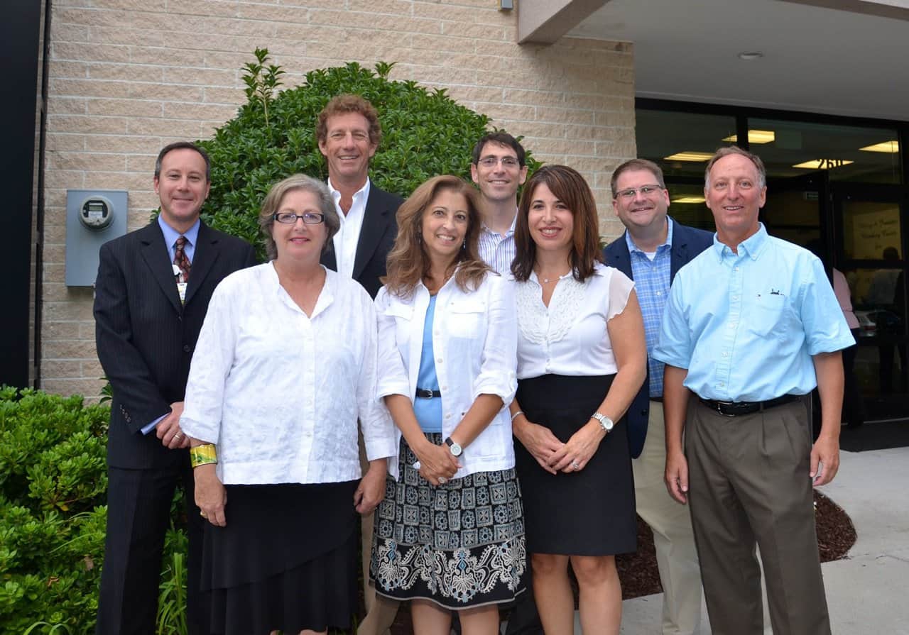 Front row: Dr. Barbara Parks, Marcia Brodie, Betty Ann Levin, and Lawrence Steingold. Back row: David Abraham, Jerry Meltsner, Jeff Cooper, and Neil Stein.