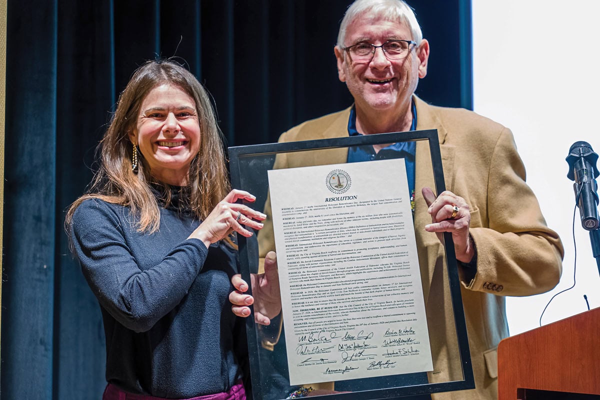 The evening began with Virginia Beach Mayor Bobby Dyer presenting a City Council resolution recognizing the Holocaust Commission, Jewish Community Relations Council, and United Jewish Federation of Tidewater for their ongoing work to educate about the Holocaust, counter antisemitism, and foster a more inclusive community. His presentation added a significant civic moment to the evening.