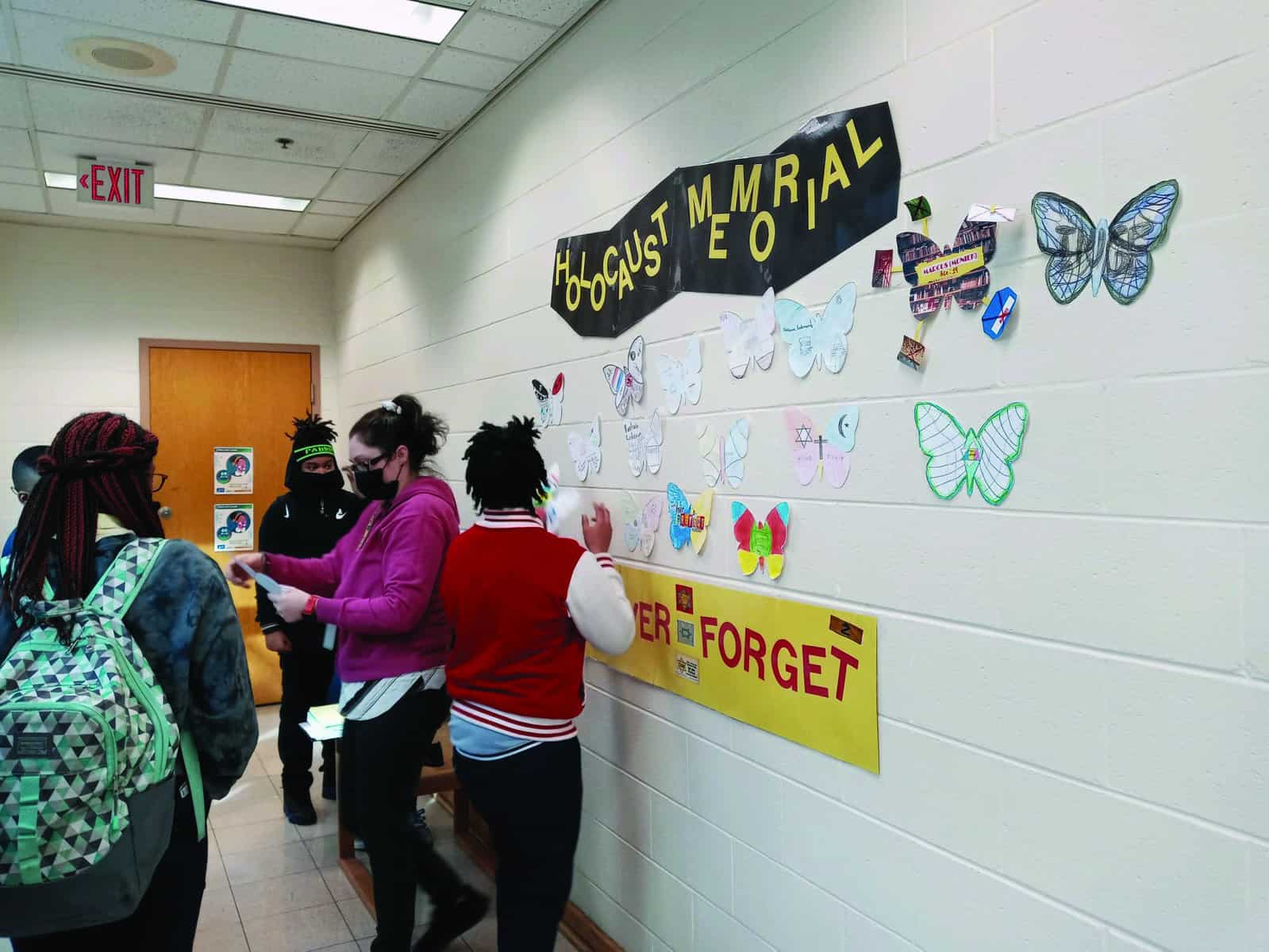 At the start of the unit, Washington assigned each student the name of a person who lived during the Holocaust, with information similar to that on the identity cards that are sometimes handed out at Holocaust Museums, to bring the enormity of the Holocaust to a personal level. During the unit, students decorated a paper butterfly to represent their person, with the name and the student’s thoughts about how they must have felt during such a difficult time. Eventually, all of the students’ butterflies were placed on the wall outside the school library.
