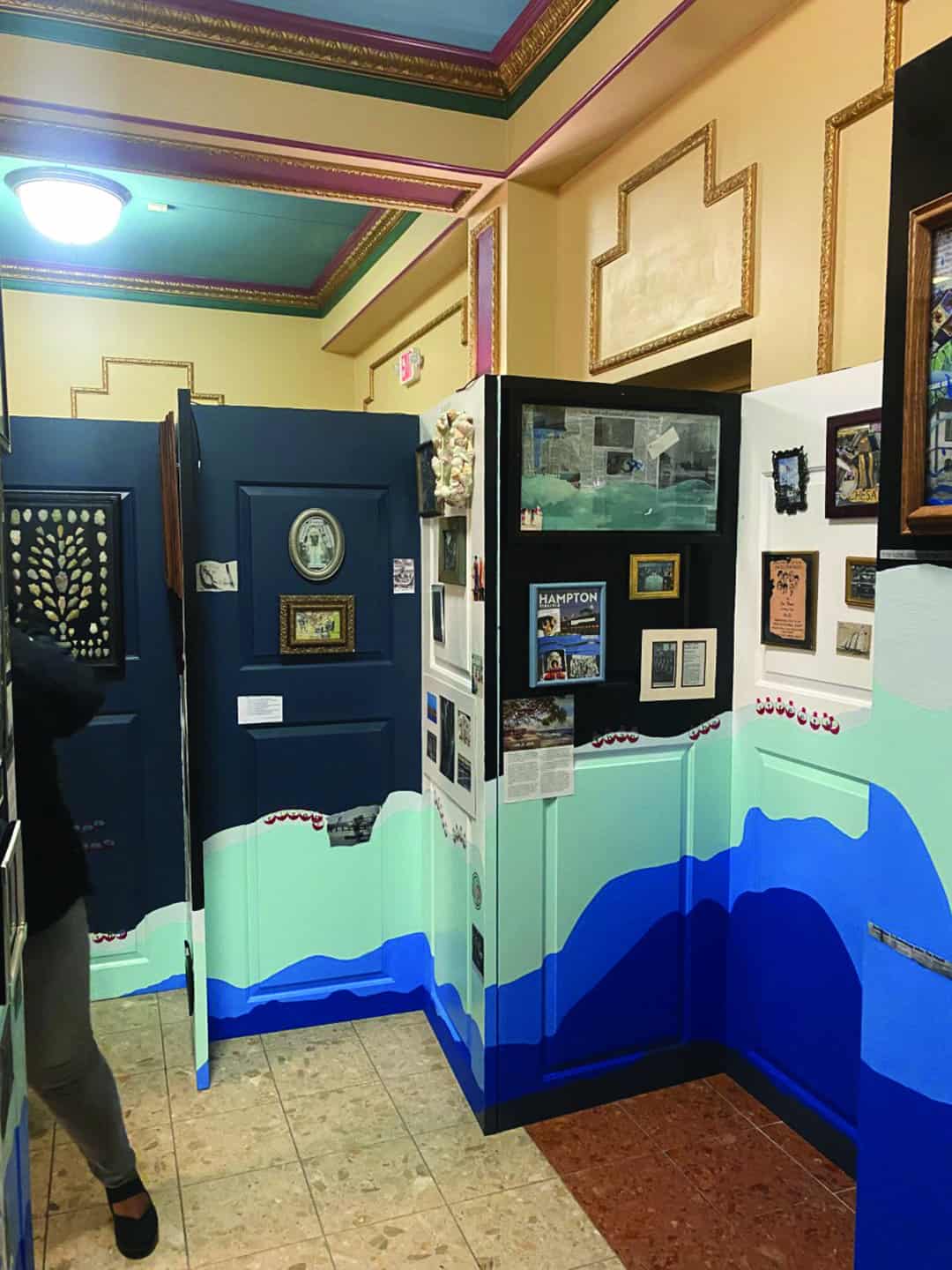 The exhibit features a series of doors grouped together in a maze-like pattern, portraying the experiences of those in the region who have historically been privileged enough to use the front door, versus the experiences of those relegated to the back door. Calway plasters the doors with print media representing the “front door” and “back door” stories, and flooding is represented through a visual rising waterline, water-damaged articles, maps, and photos.