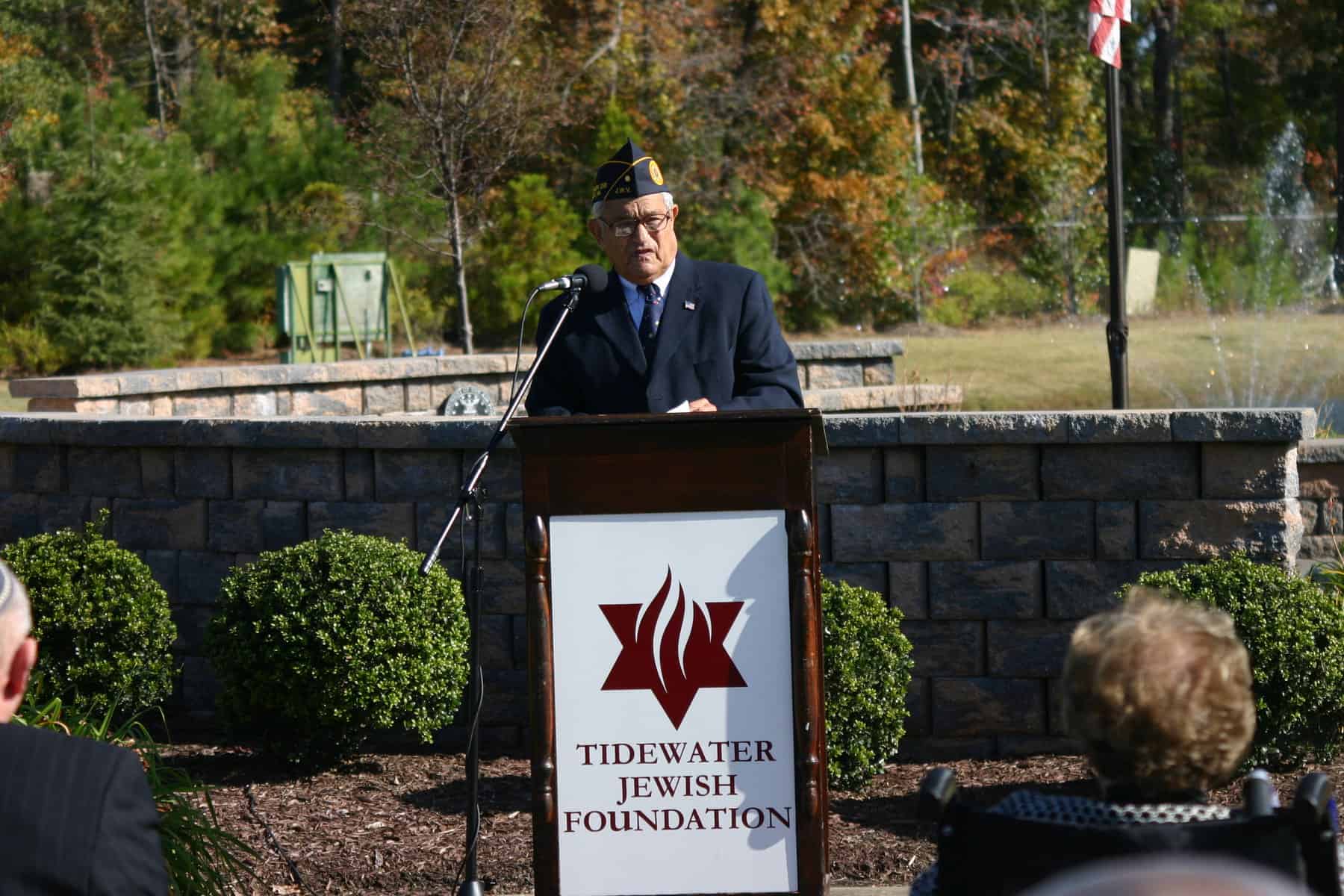 Approximately 60 people attended Tidewater Jewish Foundation’s third annual Veterans Day Memorial Service on Monday, Nov. 12. The Jewish War Veterans Monument, located on the Reba and Sam Sandler Family Campus of the Tidewater Jewish Community, was unveiled in 2010. The monument was made possible by the diligence and integrity of a group of local veterans.