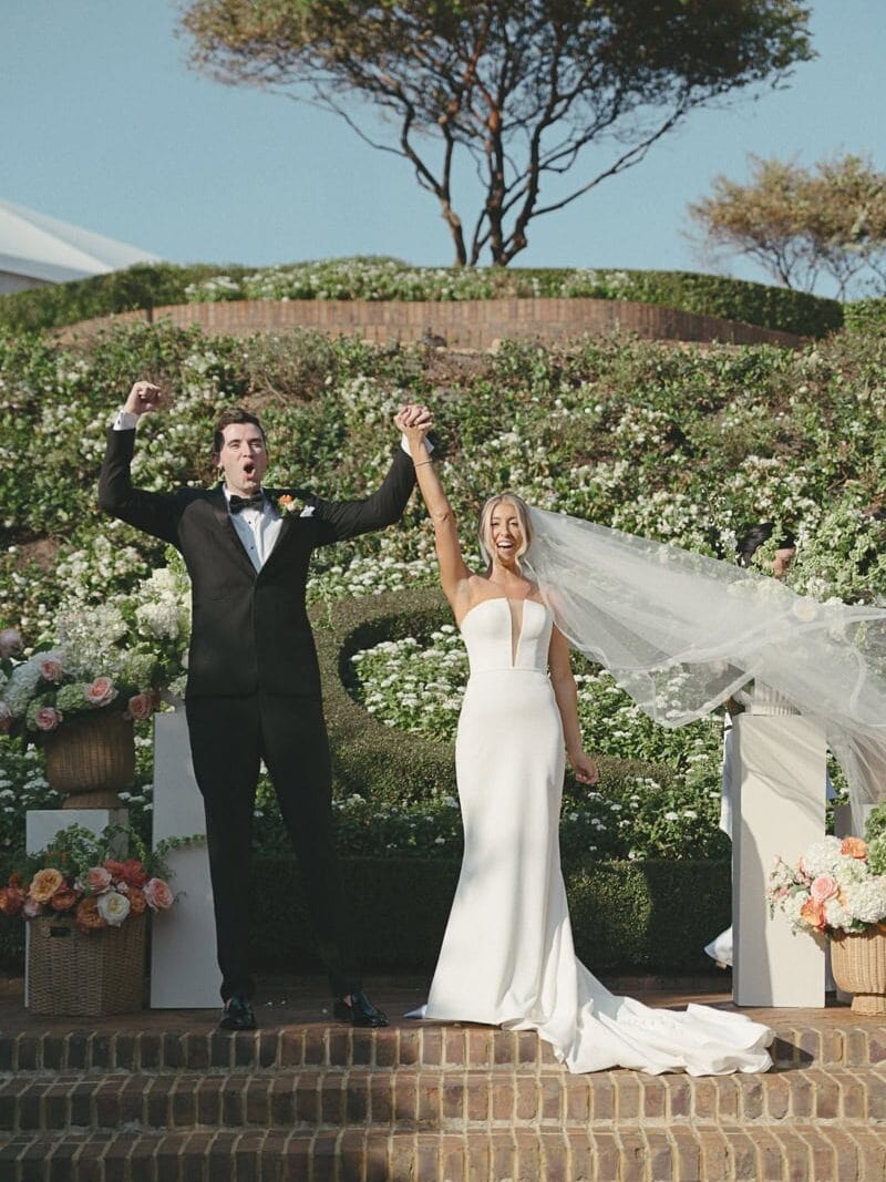 The Hartley wedding included another trend that took flight in 2025 – the color green. A New York Times article shares that 11 percent of couples chose sage as their prominent color choice this year. Bridesmaids in this wedding wore sage green dresses, and the organic theme continued over the dance floor where white flowers amidst lush greens descended from the ceiling, dotted with large disco balls for a party vibe.