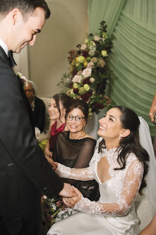 left: Alec Gershon sees his bride, Becca Schwartzman for the first time.
