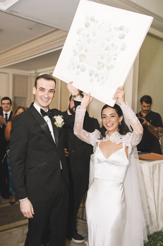When asked what was special about the wedding, Becca’s parents, Susan and Eric Schwartzman, say, “Aside from having our family and friends join us in celebrating Becca and Alec’s marriage, what touched us most was the Groom’s Tisch, the Bedecken, and the signing of the Ketubah. These customs—honoring the groom and the bride as individuals and then joyfully uniting them before they walked down the aisle to the chuppah, felt sacred and was wonderfully festive. We loved that Becca and Alec chose to make these traditions part of their wedding.”